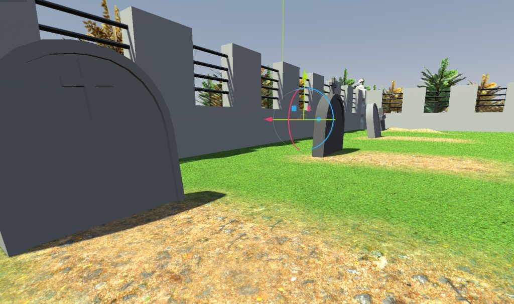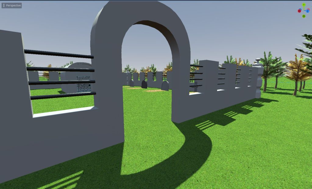 The graveyard is made, walls, graves, and the mausoleum with a working door.